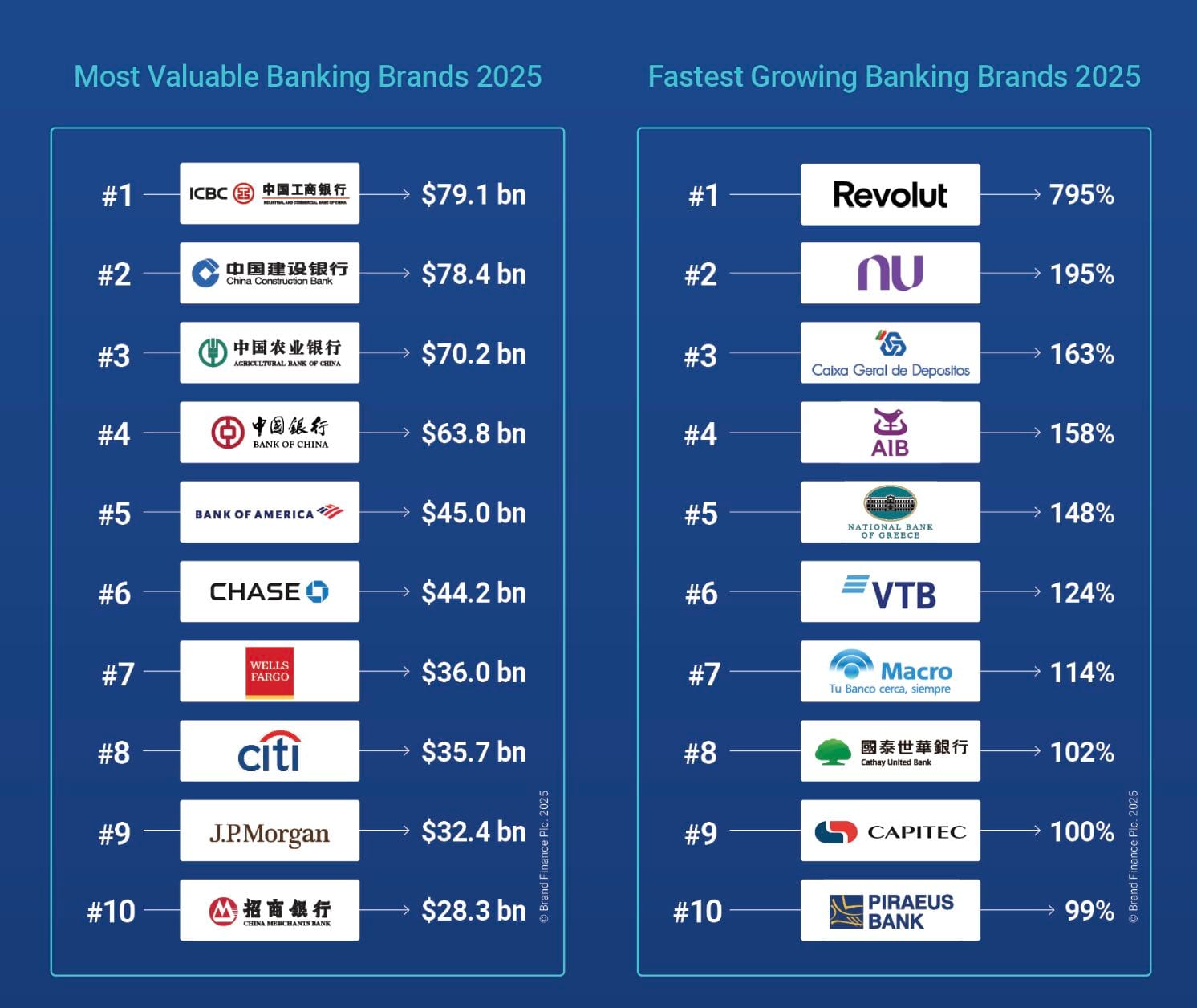 📈 Revolut is the fastest-growing banking brand globally, with a 795% increase in brand value to USD 1.9 billion, driven by marketing investment, customer expansion, and new market entry.