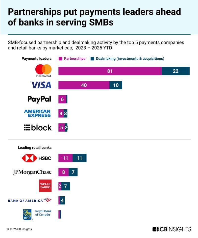 📊 SMB-focused partnership and dealmaking activity by the top 5 payments companies and retail banks by market cap, 2023–2025 YTD 👇
